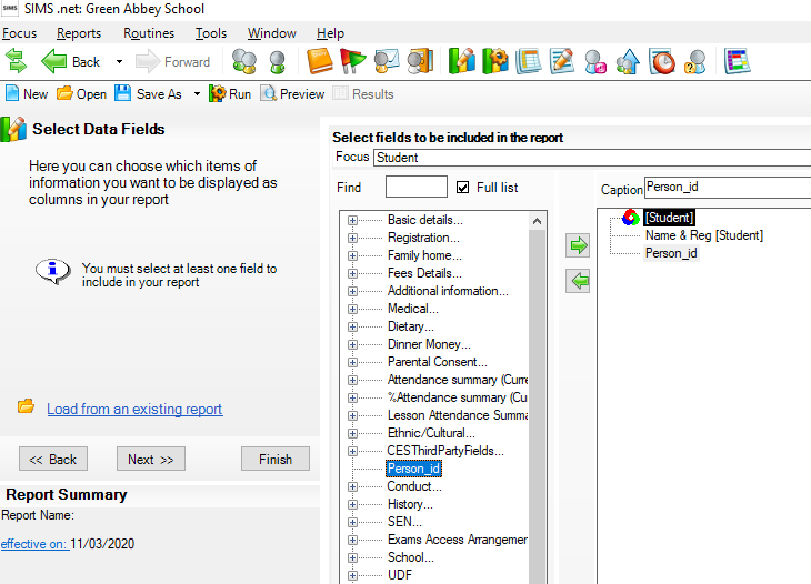 When designing the report in SIMS, include the Person_id field from the Student Focus when choosing the Data Fields for the report;